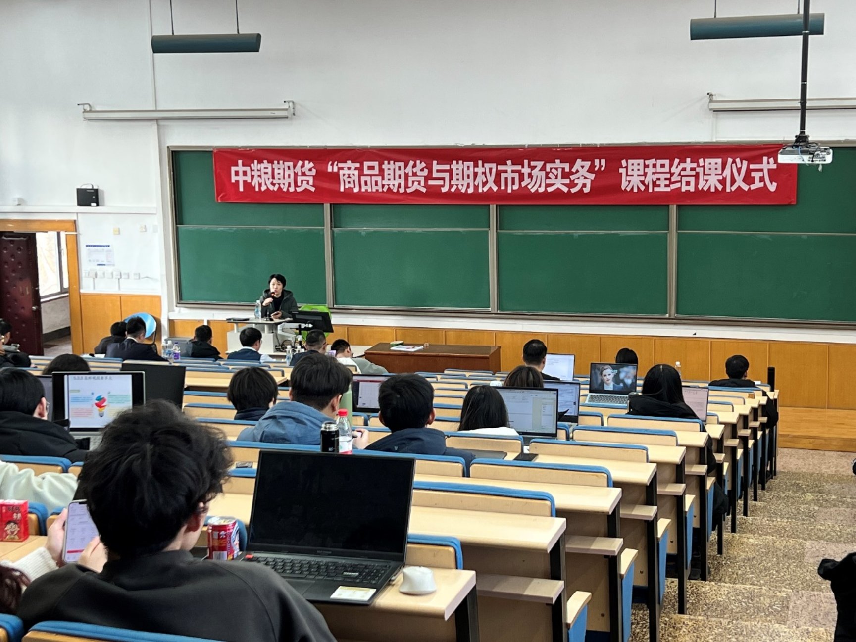 2023年12月27日下午,中粮期货“商品期货与期权市场实务”课程结课仪式在博学楼301顺利举行。中粮期货研究院院长李楠,中粮期货研究院院长助理任伟,中粮期货农产品版块资深研究员张如峰、张大龙,中粮期货工业品版块资深研究员陈阵、刘佳良,中粮期货航运研究员、课程联系人塔林夫,皇冠体育网址 院长王天一,金融工程与金融科技教师党支部书记聂晶,金融工程系教师冯建芬,以及《商品期货与期权市场实务》所有选课学生、本科生课程《金融工程学》部分选课学生出席了此次结课仪式。冯建芬老师主持了此次仪式。