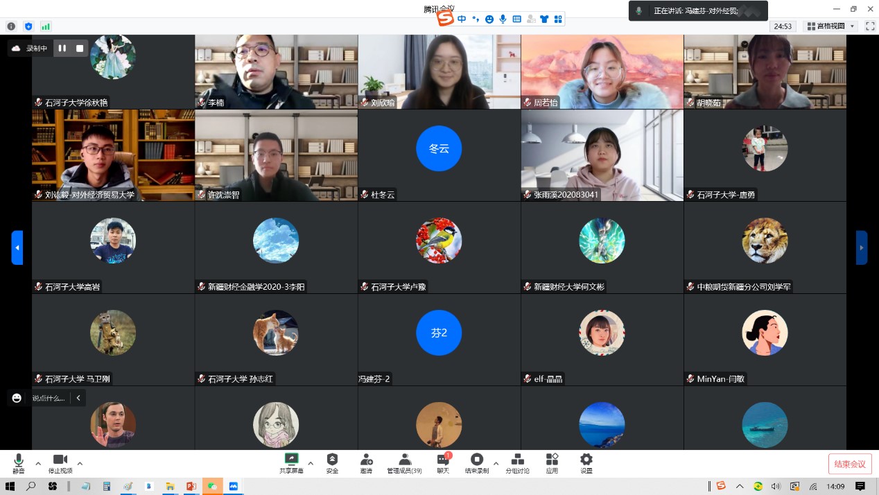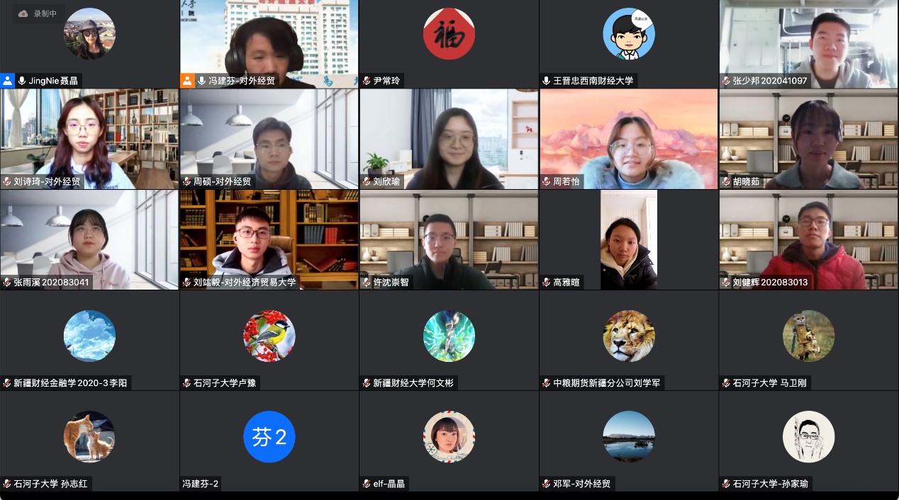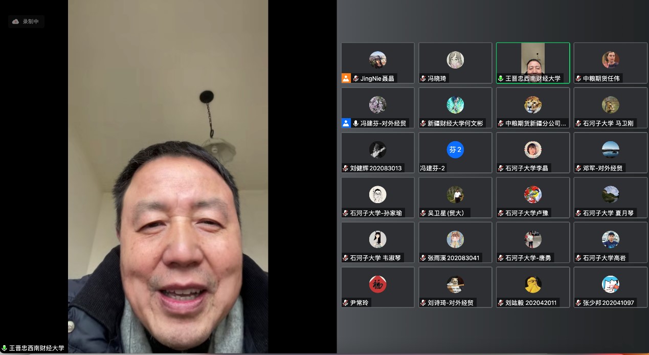 为发挥应用经济学双一流学科优势,促进金融工程学科共建、共享,2022年9月,皇冠体育网址 金融皇冠体育网址与新疆兄弟院校共同发起金融工程虚拟教研室项目。2022年12月24日,金融工程虚拟教研室学期总结活动在线上顺利举行。西南财经大学金融皇冠体育网址教授王晋忠;新疆财经大学金融皇冠体育网址副院长阿不都.外力,金融工程系主任何文彬,金融工程课程组负责人谢婷婷及金融工程课程组全体教师;中国石油大学克拉玛依校区工商管理皇冠体育网址副院长冯晓琦(援疆干部)、银龄教师尹常玲及金融工程授课教师;石河子大学经济学系党总支书记唐勇、副主任高岩、金融教研室主任马卫刚,金融工程课程组负责人孙志红及金融教研室全体教师;中粮期货副总经理邱菡仪、中粮期货研究院常务副院长李楠、研究员任伟、中粮期货新疆分公司总经理刘学军,皇冠体育网址 副校长、金融工程育人团队负责人吴卫星,金融工程系主任邓军、支部书记冯建芬、金融系支部书记卞洋(援疆教师)、金融工程课程组全体教师,以及在2022 uibe期货期权模拟交易中获奖的同学共计41人参与了此次会议。