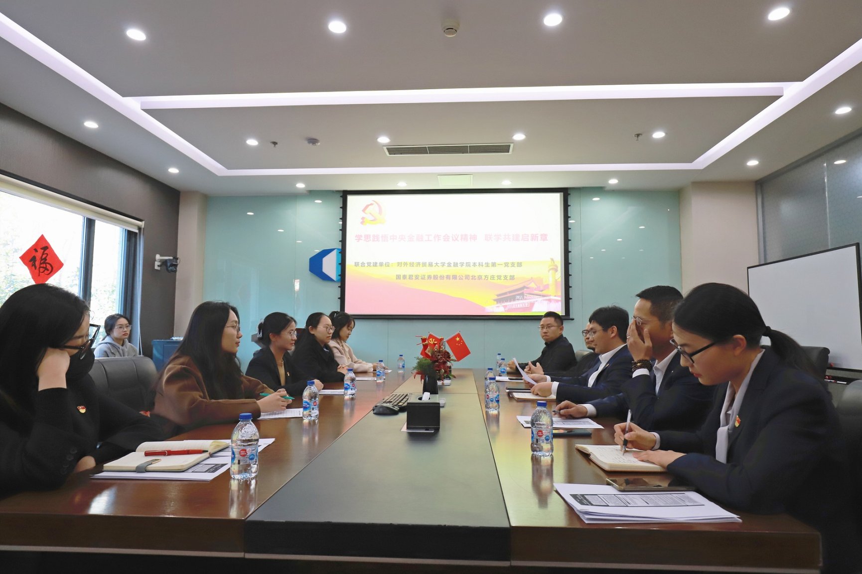 随后,何安康同志带领双方党员学习了中央金融工作会议精神。这次中央金融工作会议是在全面建设社会主义现代化国家开局起步的关键时期召开的一次十分重要的会议。会议强调,金融是国民经济的血脉,是国家核心竞争力的重要组成部分,要加快建设金融强国,全面加强金融监管,完善金融体制,优化金融服务,防范化解风险,坚定不移走中国特色金融发展之路,推动我国金融高质量发展,为以中国式现代化全面推进强国建设、民族复兴伟业提供有力支撑。此次会议,无论对金融从业者还是对金融学子而言,都指明了发展思路和前进方向,大家都肩负着建设金融强国的责任使命。