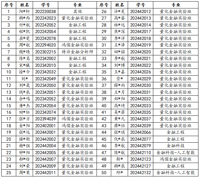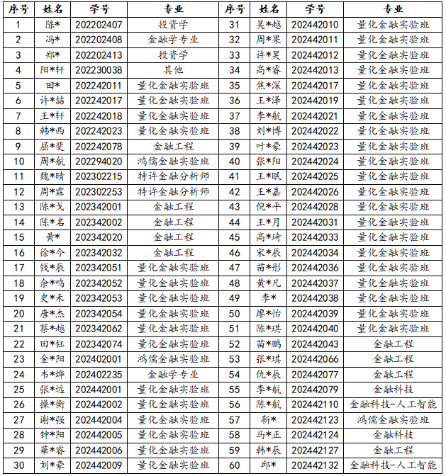 为切实强化专业实训实践教学,着力培育学生卓越的应用技能,我院金融工程专业2025年暑期实训项目已完成学员遴选工作。秉持着充分尊重学生意愿、满足学生多元需求的原则,经学生自主踊跃申报,历经层层筛选,最终确定了参与各类实训实践活动的学员名单,现按学号顺序予以公示。