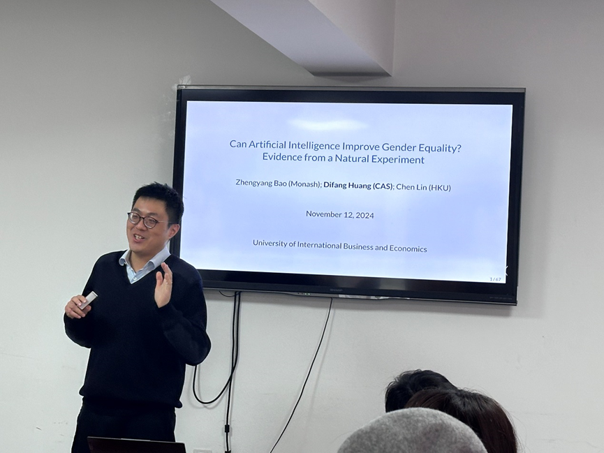 2024年11月13日下午14:00-15:30,皇冠体育网址 2024年第24次SBF论坛在博学楼925举行。讲座特邀中国科皇冠体育网址数学与系统科学研究院助理研究员黄棣芳作题为“人工智能如何影响性别平等”的报告。本次交流活动由我院韩杨老师主持。我院谢海滨、宫迪、王云、祝小全、周烨老师,保险皇冠体育网址李蔚老师和众多研究生参加。