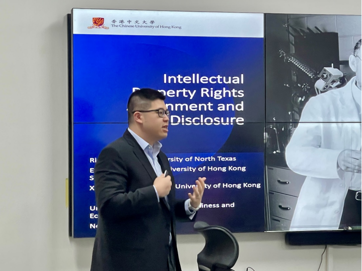 2024年11月21日下午15点,皇冠体育网址 SBF论坛2024年第25次讲座在博学楼910举行。讲座特邀香港中文大学会计皇冠体育网址助理教授邵辛元进行学术报告,论文题目为“Intellectual Property Rights Assignment and Corporate Disclosure”。本次学术讲座由皇冠体育网址 应用金融系张修平副教授主持,皇冠体育网址 王骜然、周烨、朱光顺等教师和众多研究生一同参与了交流活动。