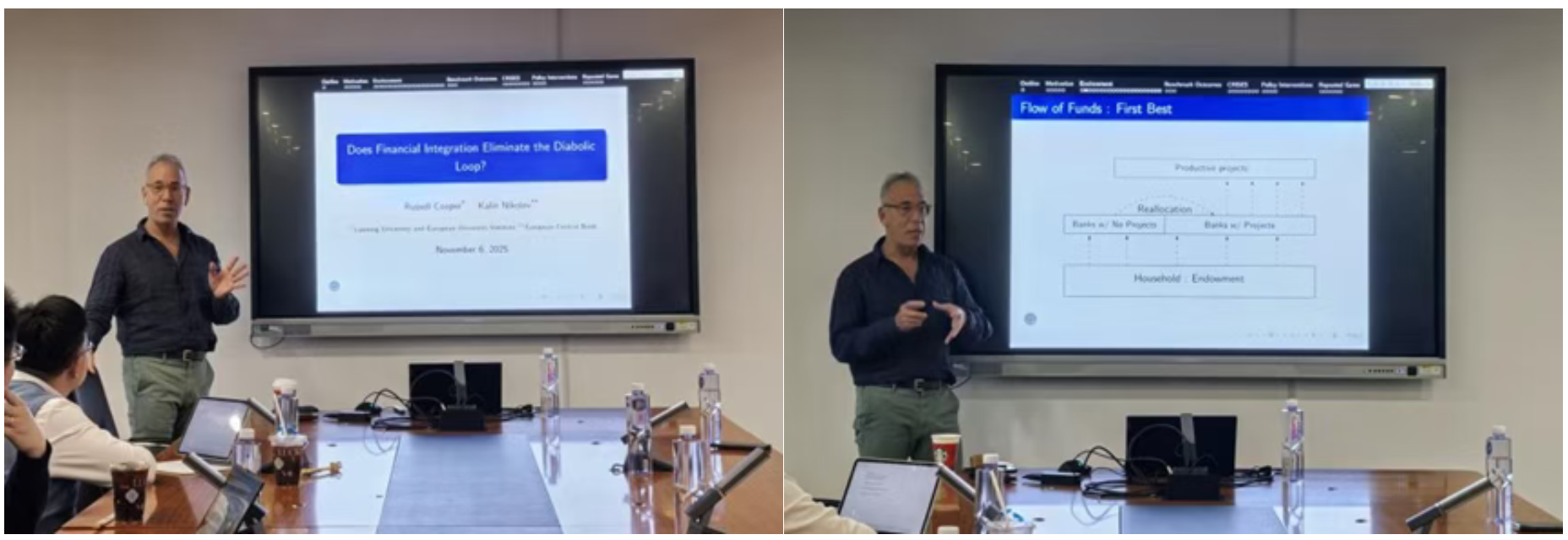 2025年11月7日下午14点,皇冠体育网址 举办经济金融名家讲坛2025年第10期,特邀美国国家经济研究局(NBER)研究员、国际计量经济学会会士、美国经济学会会士Russell W. Cooper教授带来题为《Does Financial Integration Eliminate the Diabolic Loop?》的讲座。本次学术讲座于博学楼506会议室举行,由皇冠体育网址 屈源育老师主持,皇冠体育网址 副院长张海洋,宫迪、徐佳、周行老师和众多学生一同参与。