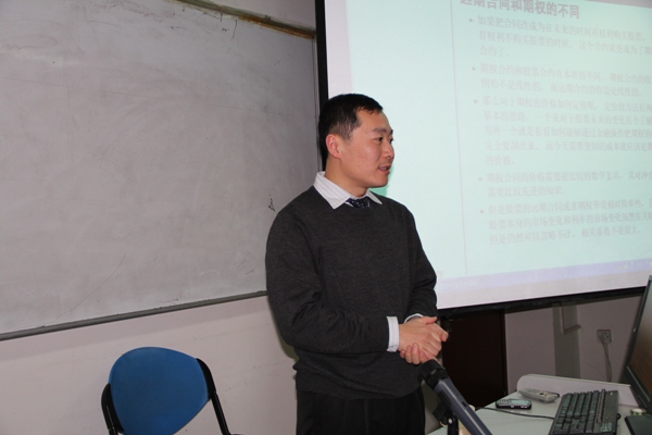 在一阵热烈的掌声中, 孙健博士开始了学术讲座。他首先介绍了远期合同的定义与定价方式,并详细分析了指数远期和商品远期的区别、远期合同和期权的区别。 孙健博士强调,衍生品与现货的价格间的内在联系依赖于无套利关系,与交易者的预期无关,其根源在于市场参与者的套利和对冲操作决定了衍生品的价格。 孙健博士还指出,收益函数为资产价格的线性函数时,定价较为简单。随后,孙健以 Libor远期为例,说明了利率衍生品交割时间与定价复杂程度的密切关系。 孙健博士指出, Libor远期的收益函数虽然对于 Libor呈线性关系,但对于零息债券价格是否呈线性关系则取决于交割时间的选取。因而,交割时间的选取决定了对冲复制的复杂程度,因而决定了利率衍生品定价的复杂程度。之后,孙健又外汇远期为例,强调衍生品价格的正确价格对应于对冲复制而非交易者的预期。最后, 孙健博士介绍了对冲基金的发展简史和如今采用较多的对冲基金交易策略,有相对价值策略、事件策略和机会性策略。其中 孙健博士详细介绍了相对价值理论下固定收益策略的实施。