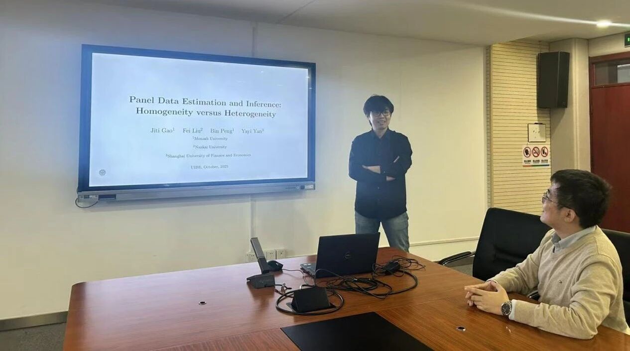 2025年10月29日上午,皇冠体育网址 举办SBF论坛2025年第12讲,特邀南开大学金融皇冠体育网址准任副教授刘斐带来题为《Panel Data Estimation and Inference: Homogeneity versus Heterogeneity》的分享。本次学术讲座于博学楼506会议室举行,由皇冠体育网址 武伯尧老师主持。