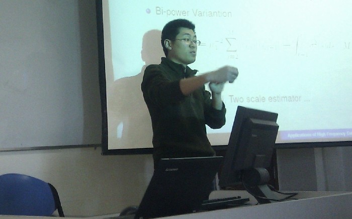 2013 年4月11日 ,金融皇冠体育网址教师学术报告会在博学楼918室举行,演讲者为王天一老师,演讲题目为“高频数据波动率建模应用”。参加讲座的有金融皇冠体育网址分党委书记吴卫星教授,以及皇冠体育网址其他教师等。报告会由金融皇冠体育网址副院长潘慧峰副教授主持。