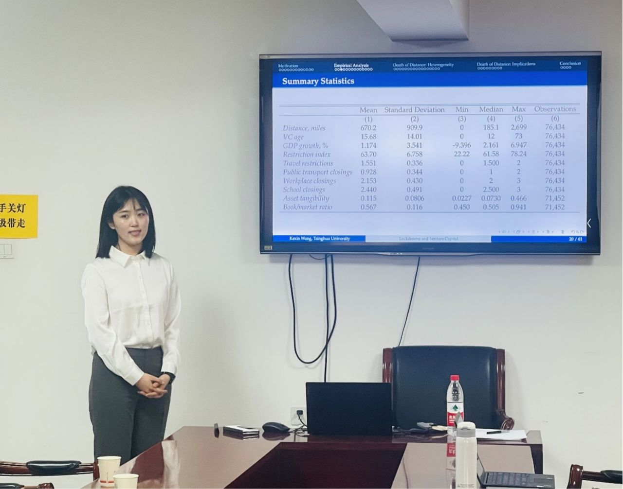 王可心博士首先介绍了风险投资多需实地调研,因此地理距离是风险投资一个非常重要的影响因素。王可心博士指出,疫情期间实地调研难度增加也许会对风险投资距离产生影响。实证方面,王可心博士基于2007-2021年全球49个国家超过4000家风险投资机构的投资数据,探讨了疫情封锁如何影响全球风险投资的地理分布。首先进行线性趋势分析,然后构建双重差分模型,均发现风险投资者在疫情封锁期间更加倾向于投资地理距离较远的初创企业,这一现象在经济重启后仍然持续。接着,王可心博士指出,造成这一现象的主要原因是远程通讯技术的运用和普及,降低了信息不对称和监督成本,并基于此进行了对互联网建设水平、信息不对称程度以及交易规模三方面的异质性分析。经济后果方面,王可心博士指出远距离投资的普及在一定程度上缓解了创业融资不平等问题。最后,王可心博士就风险投资、政府引导基金、企业创新和数字技术等领域的研究做出了进一步展望。