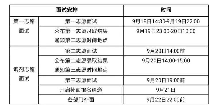 面试规则:面试于9月18日开始,具体时间将短信通知,如有冲突自行商议解决。已通知时间地点的面试需按时参加,否则将影响录取。未参加第一志愿面试,则失去调剂志愿面试机会;调剂同学未参加第二或第三志愿面试的,则失去顺次志愿录取资格。如未参加第二志愿面试,则二、三志愿均不得录取。