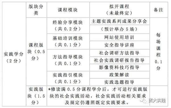 社会实践为必修课,四学年应修满2学分,参加上述活动累计时间达到100学时(约72小时),并提交完整实践成果即可申请相应学分。具体修读版块学分要求如下: