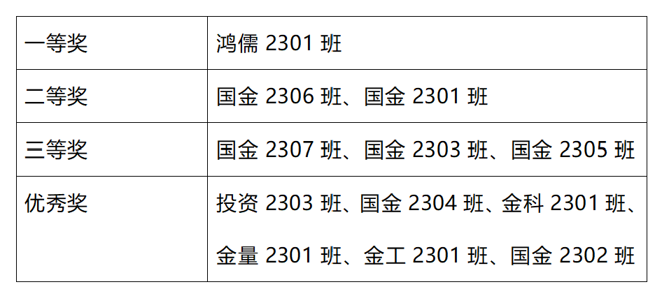 经过激烈焦灼的现场计分之后,主持人向各与赛班级公布了此次比赛的获奖情况如下表所示: