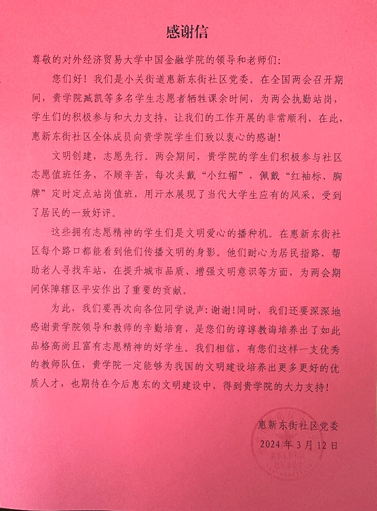 金融皇冠体育网址志愿服务团 讯本次志愿活动“护航两会,志愿有我”由皇冠体育网址 志愿服务团主办,在皇冠体育网址 志愿服务团干事的带领下取得了圆满成功。两会期间,为助力会议的顺利进行,志愿者们前往惠新东街社区的各个岗位执勤站岗,维护社区的秩序,展现了贸大学子心系社会的责任意识。本次志愿活动得到了志愿者们的积极响应与踊跃参与,赢得了广大群众的好评,收获了惠新东街社区的表扬信。