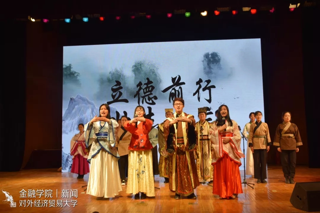 金融皇冠体育网址代表队围绕《习近平用典》立德篇创作节目《立德诵》,作品通过诵读、吟诵、情景表演、乐器演奏、书法表演等形式,从“为什么立德、立什么德、怎样立德”三个层次,国家、家庭两个角度立体地展现了“立德”和“吟诵家国”的主题。