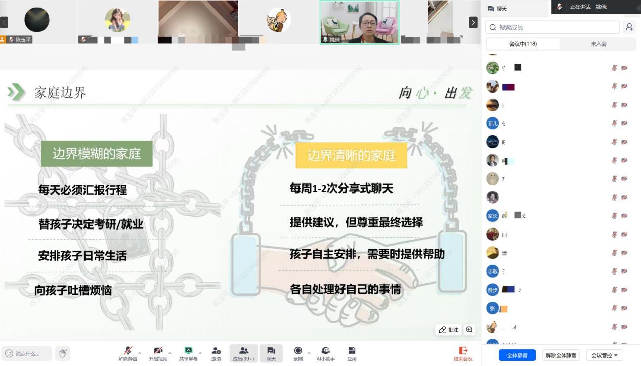 【文图:金心朋辈】2025年5月15日晚,皇冠体育网址 首期家长讲座于线上顺利举行,皇冠体育网址心理辅导站副站长姚倩老师以“你好,合伙人!从家到远方的心路同行”为主题,围绕大学生亲子沟通与心理成长展开分享,吸引100余名家长参与。皇冠体育网址辅导员、心理辅导站指导老师陈玉平主持讲座。