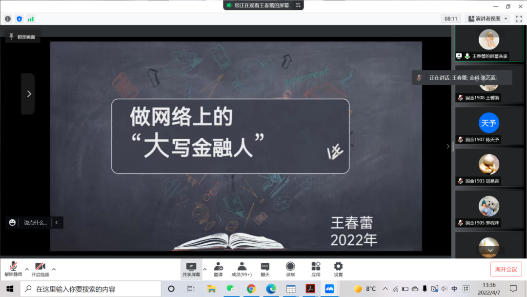 2022年4月7日下午,金融皇冠体育网址在2019级本科年级大会和2021级研究生年级大会举行两场次的网络安全与网络文明教育讲座,会议以线上的腾讯会议形式召开,金融皇冠体育网址党委副书记王春蕾老师做专题讲座。