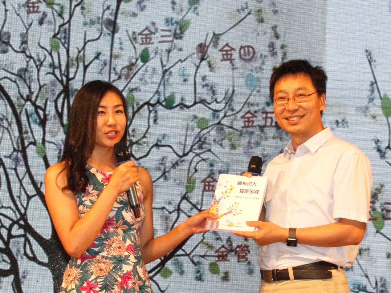 歌毕,毕业生代表向院长吴卫星赠送了2012级学子共同制作的纪念书《情系贸大,爱留金融》,作为2012级毕业生留给金融皇冠体育网址的礼物