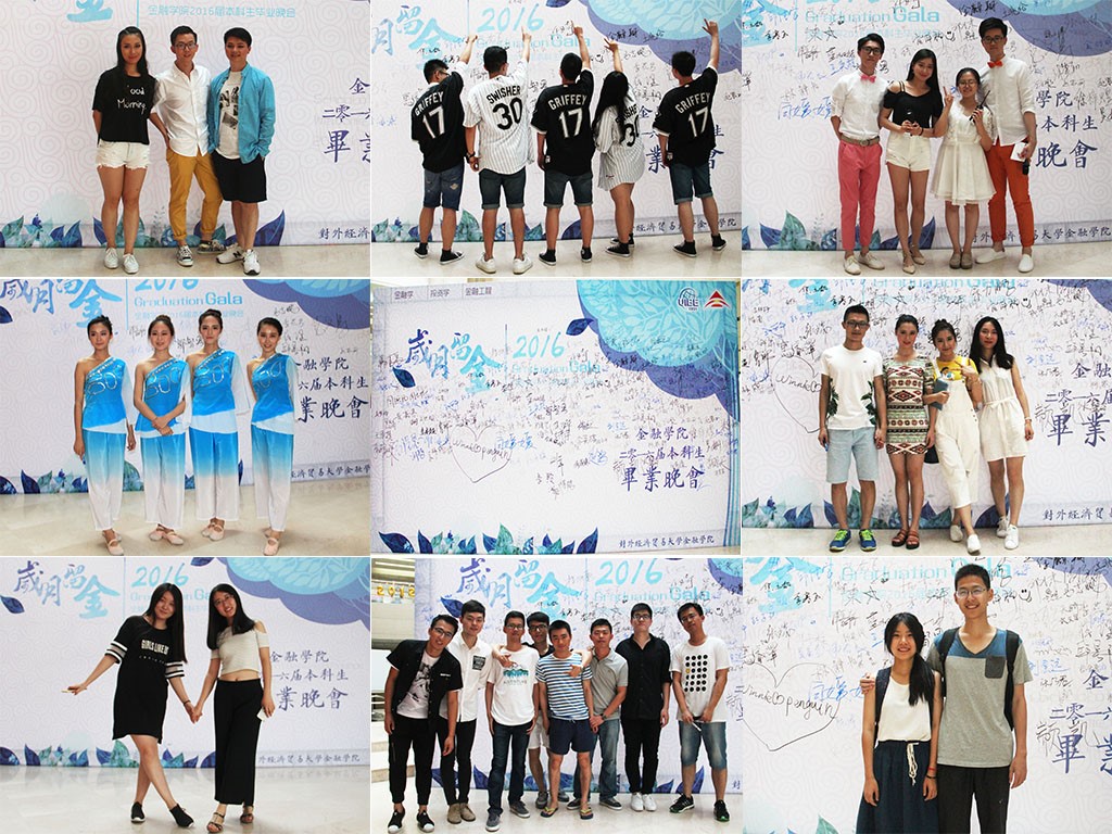 人头攒动,灯光闪烁。在温情音乐和五彩气球的轻轻碰撞中,教师和学子们陆续走进会场。门外的红毯更是热闹,毕业生们争相走上红毯摆好姿势,与老师、与友人合影留念,将最珍贵的时光留存于相册中。门内“岁月留金”的签名墙渐渐被毕业生的名字填满,签名墙前合照的师生换了一批又一批,毕业生们却仍久久停留着,一遍遍地合影留念,直到晚会即将开始,才不舍地走向会场,留下的是存在于这时光中一个个金院人飞扬的笔迹和最美的微笑。