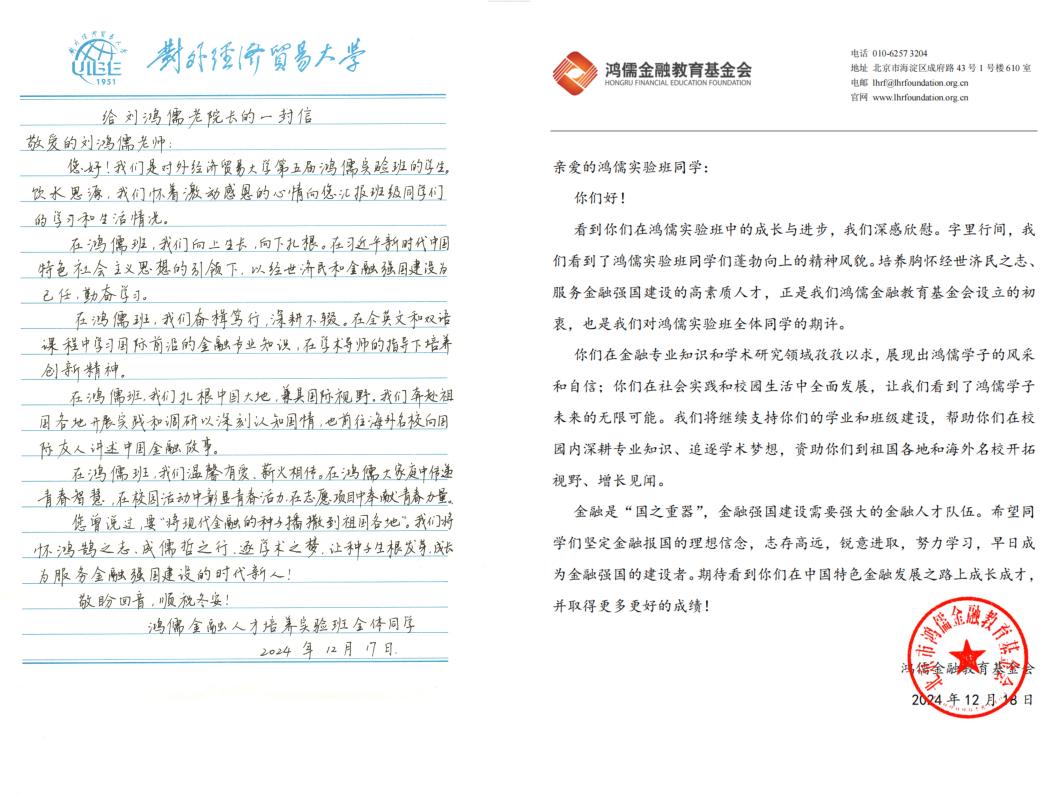 鸿雁传书,儒耀有方,鸿儒2201有幸收到刘鸿儒老院长委托鸿儒金融教育基金会回信,鸿儒2201将铭记鸿儒先生教诲,在推进金融高质量发展中展现鸿儒学子作为、彰显鸿儒学子风采、贡献鸿儒学子的青春力量,争做担当金融强国建设大任的时代新人!