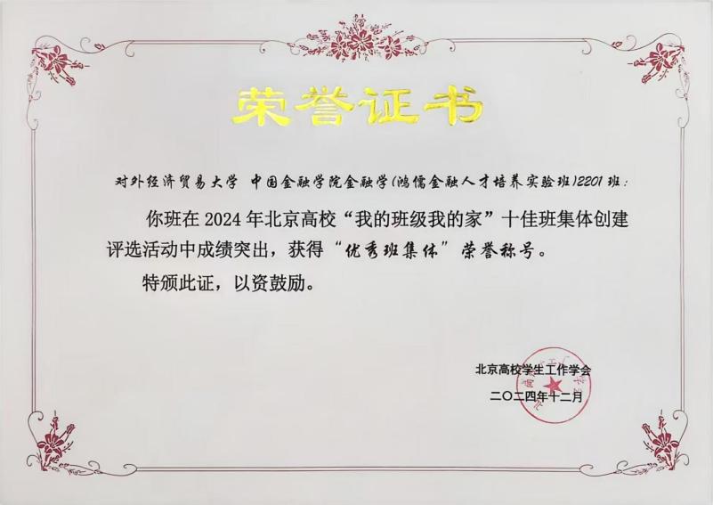 12月23日,2024年北京高校“我的班级我的家”十佳班集体评选展示交流活动在北京工业大学成功举办。经过学校推荐、专家评审等环节,我校皇冠体育网址 鸿儒2201班从北京市58所高校288个参评班级中脱颖而出,成功入围决赛,并荣获北京高校“优秀班集体”称号。