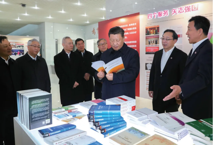 ※ 2019年1月17日,习近平总书记在南开大学参观百年校史主题展览时,仔细翻阅天津市教委组织编写的思政教学指导方案。