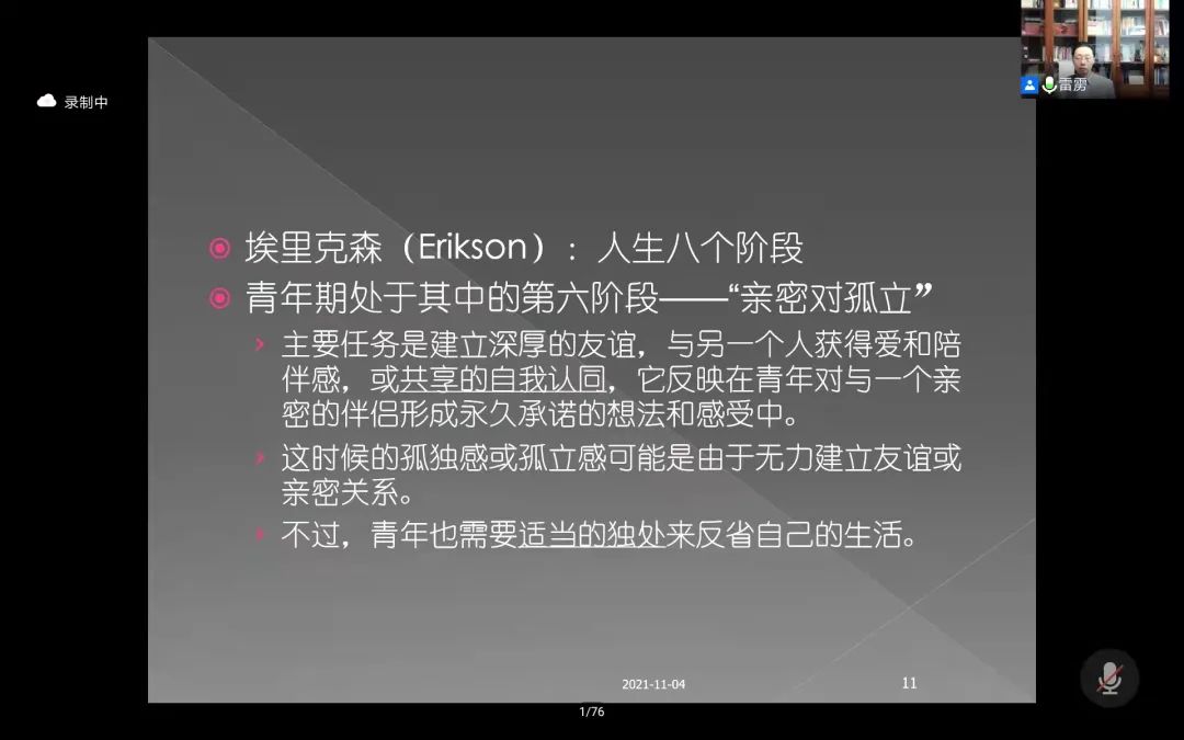谈及大学生情感需要,雷雳教授认为大学生们处于“亲密对孤立”的人生阶段。青年期逐渐拥有的如建立友谊,寻求伴侣的想法,其本质在于亲密关系的建立,以此获得爱、陪伴感和共享自我认同。