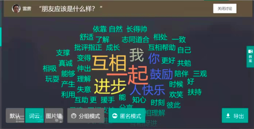 在讲座结束的提问环节,同学们结合自己的生活经历和讲座内容,积极发表自己对于相关话题的看法。教授使用软件“词云”功能提炼出共通观点并有代表性的进行了耐心的讲解。