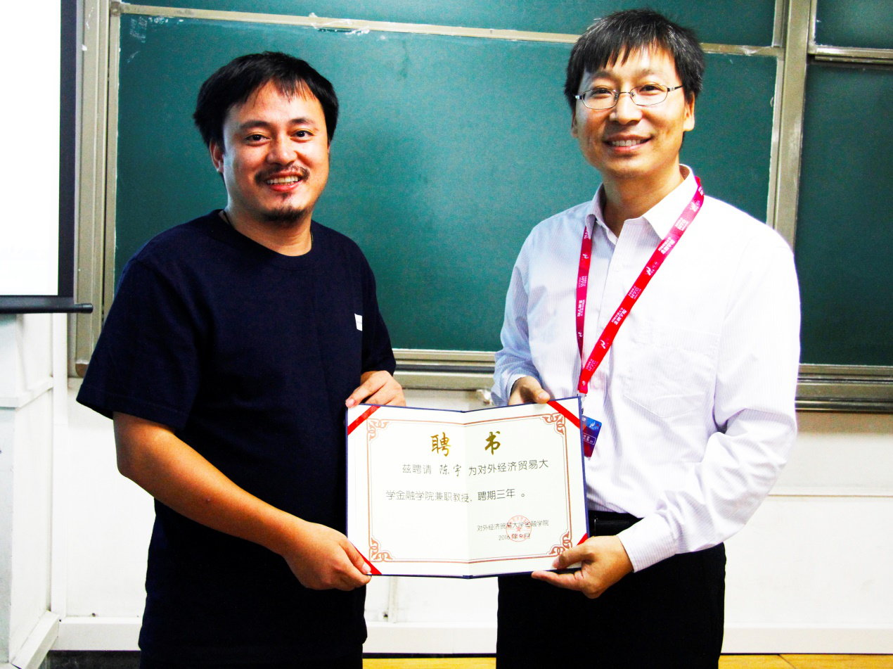 (吴卫星院长向陈宇校友(左)颁发金融皇冠体育网址兼职教授聘书)
