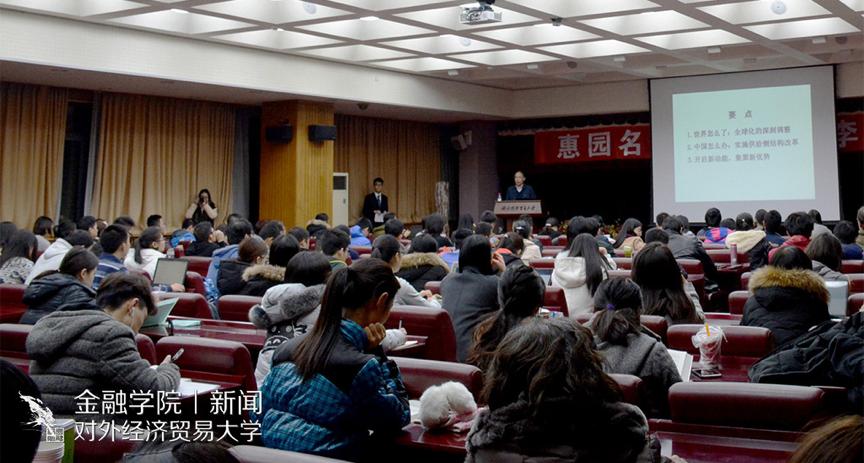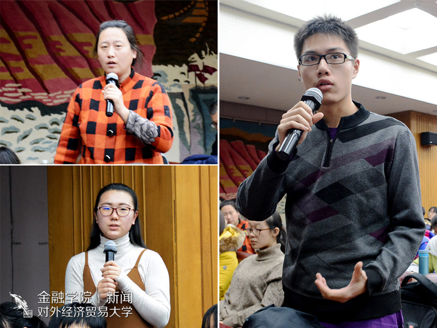 在讲座最后的观众提问环节中,李健先生说我们中国不能止步,坚持发展一带一路和改善周边贸易伙伴关系,要共享发展成果。他同时提出,我国今后可能与发达国家相似,外贸将与金融结合,竞争力主要体现在金融、外贸、服务等方面。“作为对外经贸大学的学生更要带着这样的思想学习金融,坚持改革开放等国家政策”。最后,李健谦虚鞠躬,致谢每一位听众。