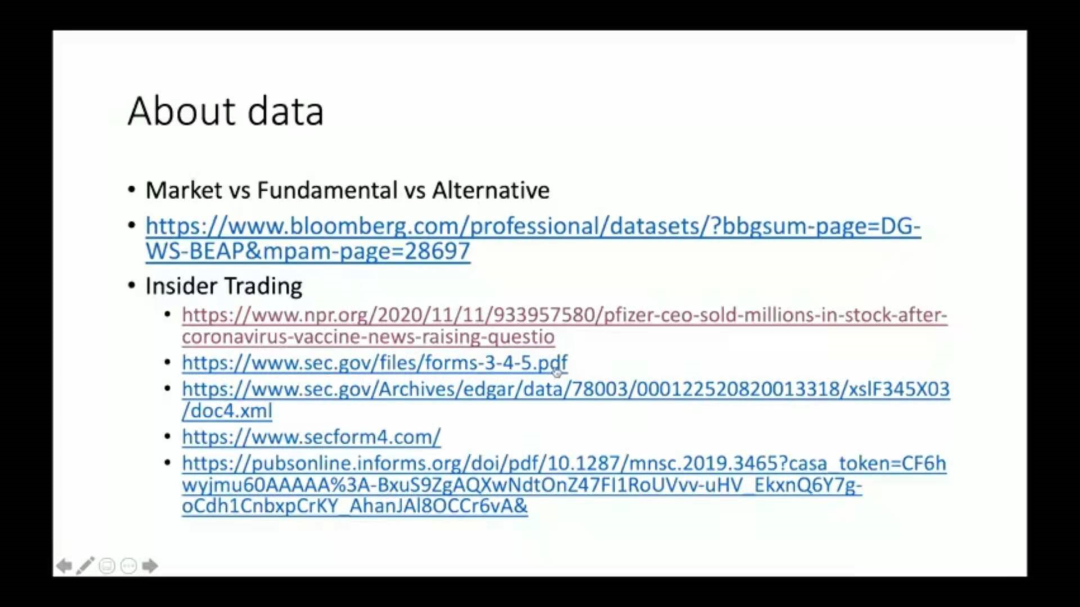 于交易数据,学长简要介绍了三种数据(market,fundamental,alternative),并阐述了量化金融行业的交易信息搜集要求。
