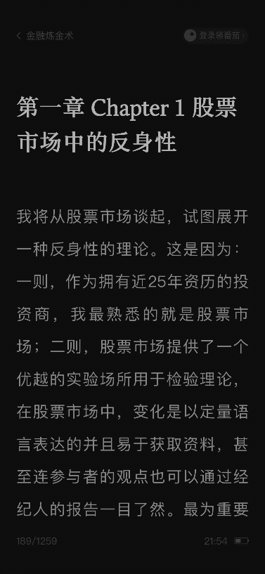 索罗斯第一章从股票市场开始谈论市场的反身性,并给出了他的理由:从股票市场中谈起的另一个原因,是股票市场能够提供研究反身性现象的最佳切入点,股票市场和任何市场一样满足充分竞争理论的标准:一个中央市场,同质的产品,低廉的交易和运输成本,便捷的通讯系统,足够数量的参与者以保证没有人能够在日常的交易过程中左右市场价格,对内部交易的控制规则,以及向所有参与者开放有关信息的特殊保障,还能要求什么更好的条件呢?要是有什么地方能够实践充分竞争理论的话,股票市场无疑是最合适的。