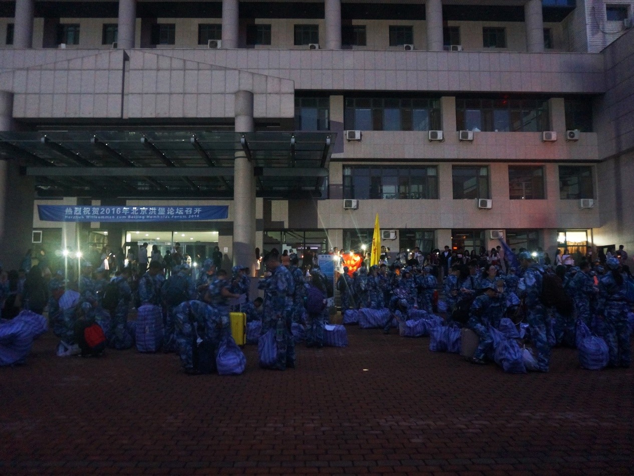 背起行囊,穿起军装,金院学子于诚信楼前集合等候,虽然学子们大都4点多钟便起床准备出发,但是每个学生的脸上都没有丝毫的疲倦,取而代之的是即将出发去军训的兴奋和期待。