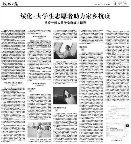 2月19日,《绥化日报》报道了我院学生党员陈家仪在家乡发起“薪火相传,益学抗疫”志愿项目,为抗疫一线人员子女进行课业辅导的相关事迹。截至2月28日,共有130余名大学生志愿者通过该项目为百余名绥化市抗疫一线人员子女进行辅导,志愿者累计工作时间近4500小时。面对疫情大考,我院学生党员勇担责任,再次诠释了青年党员的责任与担当。