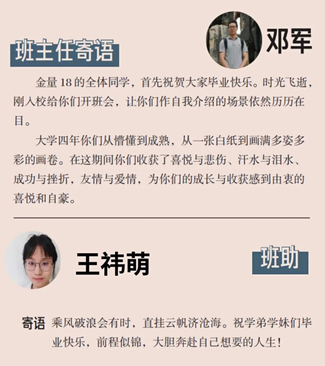 “纵有千古,横有八荒,前途似海,来日方长。”转眼间四年就要过去,我们在惠园相遇,也在惠园道别,但纵然分别,我们的故事也还会继续下去。祝愿所有同学毕业快乐,此去一帆风顺,前程似锦,谨记“博学、诚信、求索、笃行”的校训,不负韶华,不负使命!
