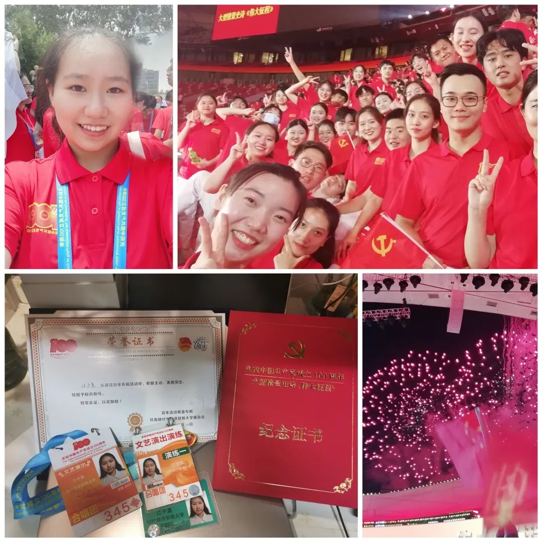 回望大学生活,最令她难忘的一定是参与重大活动与实践的经历。2021年6月,值中国共产党建立100周年,她积极参与了大型情景史诗《伟大征程》的录制,并担任第二中队四小队副队长,负责小队健康情况上报、协助中队后勤准备工作,始终以百分百的激情认真对待每一次训练,获“团队标兵”称号。作为一名大学生党员,她记得每一次党支部活动带给她的触动,诚信楼前冉冉升起的国旗承载着一二九学生运动气壮山河的爱国情怀,亲手栽种树苗后对它的满心期颐就像是时代赋予这一代青年人的责任与使命。鸟巢夜空中绽放的烟火在她心中留下了烙印,时刻提醒她与家国同心、与时代同行,做一个真正对社会有用的人。