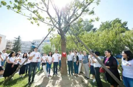 庆祝大会结束后,举行了94级校友捐赠元宝枫树仪式。为感恩母校的培养,94级全体校友向学校捐赠元宝枫树一棵,栽种在金融广场。齐天翔书记、缪琦副秘书长、94级校友代表左坤、梁媛共同为元宝枫树揭牌。