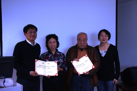 会议第三项,学院隆重颁发2010年度学院特殊贡献奖, 邱兆祥教授 和唐春梅老师荣获此项殊荣。由丁志杰院长和郭敏书记分别为他们颁发荣誉证书。