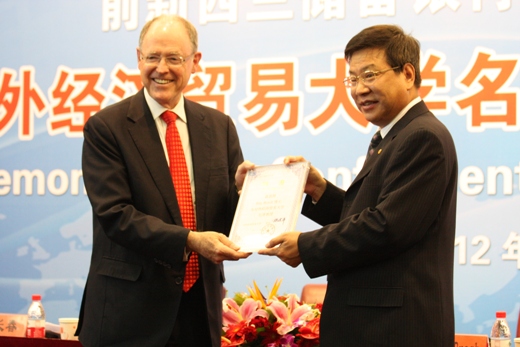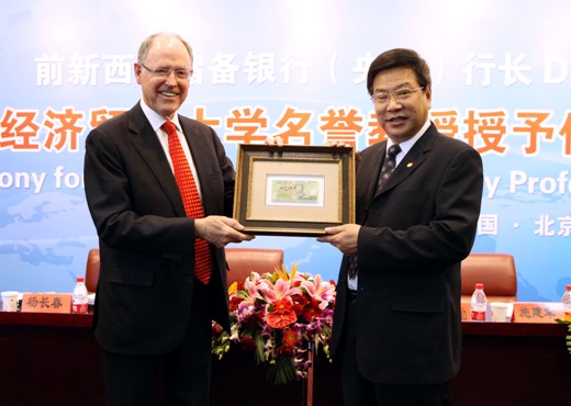 2012 年9月14日 ,新西兰前国家党领袖、前央行行长、世界银行经济学家唐·布拉什先生访问我校,前新西兰储备银行(央行)行长Don Brash 博士皇冠体育网址 名誉教授授予仪式暨主题报告会隆重举行。皇冠体育网址 校长施建军、校长助理杨长春、国际交流合作处处长夏海泉、金融皇冠体育网址分党委书记吴卫星、院长助理潘慧峰、金融市场中心主任张海云等出席了仪式。授予仪式由校长助理杨长春教授主持。