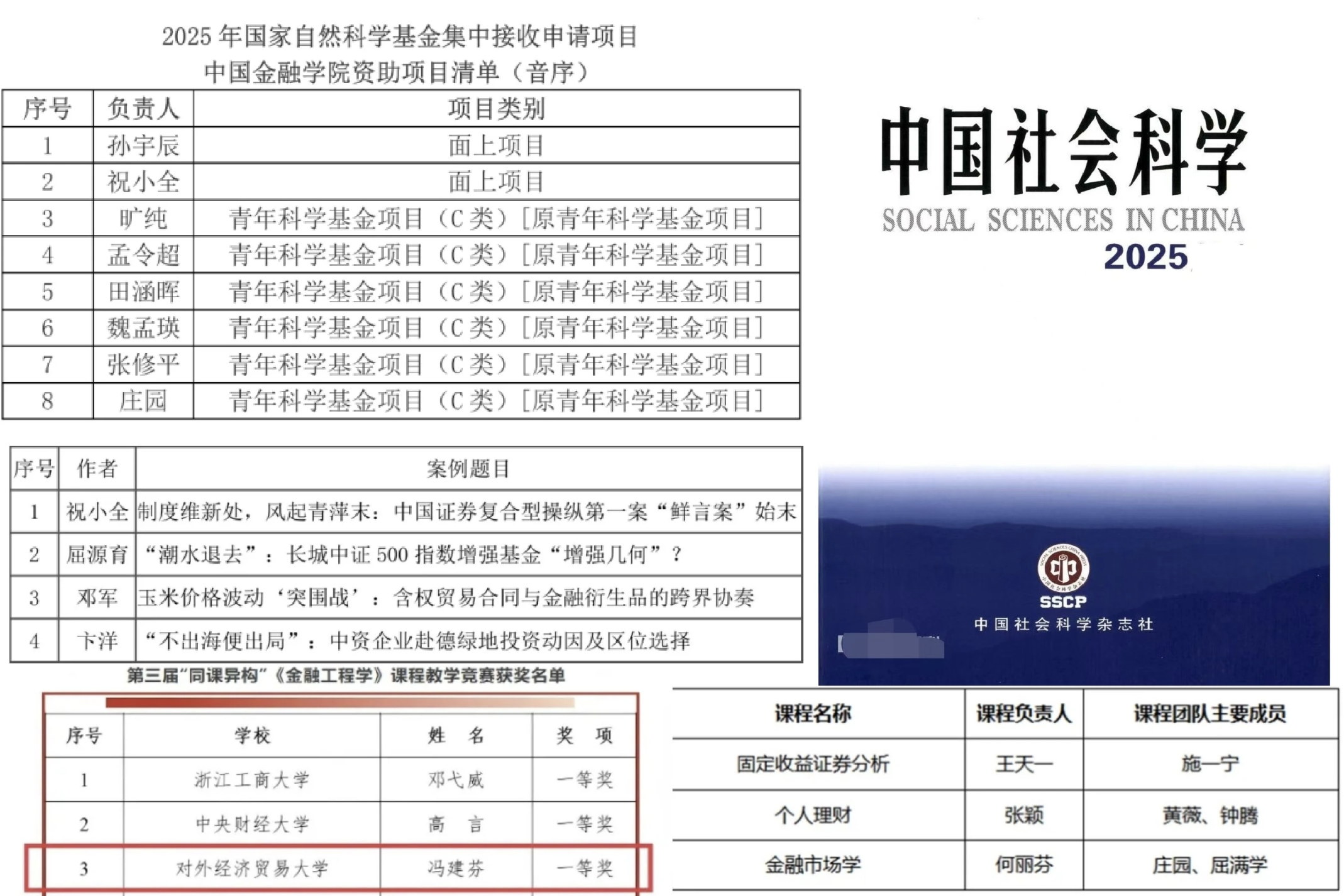2025 年,学院教师持续关注经济金融领域最新理论与前沿实践动态,论文发表成果丰硕。全年正式发表论文 78篇,出版教材1部、专著1部。期刊分布涵盖《中国社会科学》《管理世界》《Management Science》《Journal of Law & Economics》《European Economic Review》《Journal of Business & Economic Statistics》等。产出高水平智库成果23项,获得国家级课题10项。《固定收益证券分析》《个人理财》和《金融市场学》等3门课程成功入选第三批国家级一流本科课程,持续高质量推进本科课程体系建设。教师在第三届 “同课异构”《金融工程学》课程教学竞赛中荣获一等奖。4 项案例成功入库2025 年中国金融专业学位案例库。