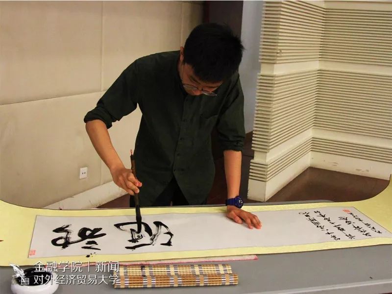 最后的“青春与文化的融合”环节中,金融皇冠体育网址2017级本科生、校书画协会成员黄津现场展示书法《融》并赠送给了Michael R. Powers及其夫人。书法作品上“融汇远航”四个字,体现了国际文化的相互交融以及金融文化的蓬勃发展,同时也包含着贸大人引以为傲的的远航精神。