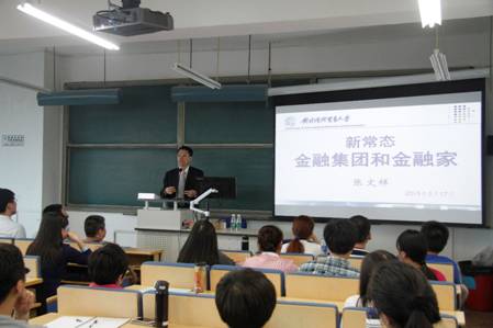 讲座中,张文祥教授运用自己从业以来的深厚积淀,向大家讲授了经济新常态下的金融集团现状、前景及当代金融家必须具备的素质。他以中国银行、中信集团和平安集团为例,介绍了中国大型金融集团目前的发展状况,并从金融集团组成链角色、层面机构、运营监测和全面监管四个维度层层深入,剖析金融集团的经营架构和治理模式。并从丰富而生动的案例中概括了当代金融家必备的三大能力,即:系统化战略思维能力、多条线多板块协同能力和多元化平台产品整合能力。他指出,未来的金融业将会从以商业银行为核心的金融体系转变成为以金融集团为核心的金融体系,作为贸大金融皇冠体育网址的学子,应该肩负重任,“在位做事,越位思考”,积极培养系统化的战略思维,拓展视野,将自己打造为具有“国际范儿”的金融家,为新常态下中国金融事业的发展贡献应有之力。