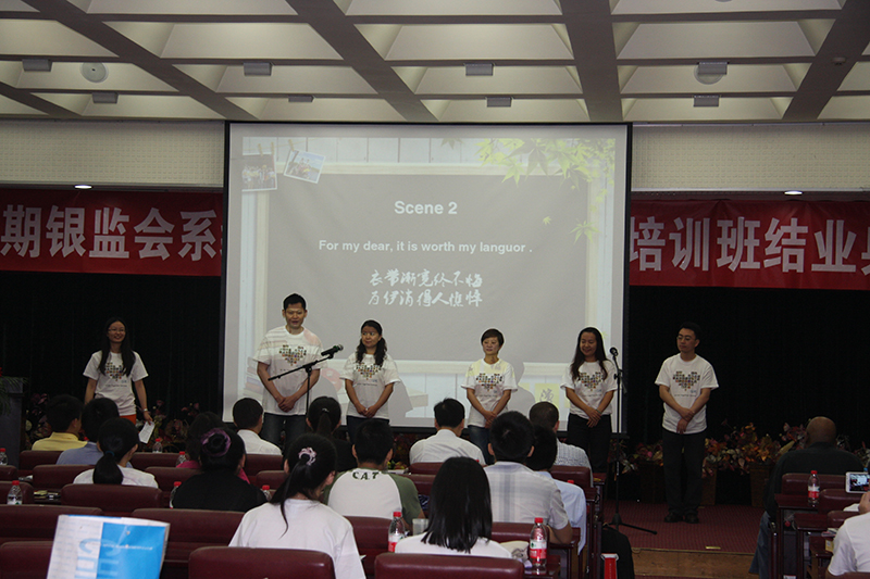 典礼首先由培训班学员用英文进行汇报表演。学员们用新闻播报、辩论赛、访谈等丰富多彩的形式,展现出流利的口语、准确的专业词汇,出色的表演赢得了在场领导 和 老师们的一致好评。汇报表演后,班长王敏同学发言。他说,三个月的校园生活,让我们忘不了同学刻苦学习的精神,忘不了同学之间的友谊,忘不了贸大老师的付出,感谢银监会和外经贸大学为大家提供了这样难得的机会。