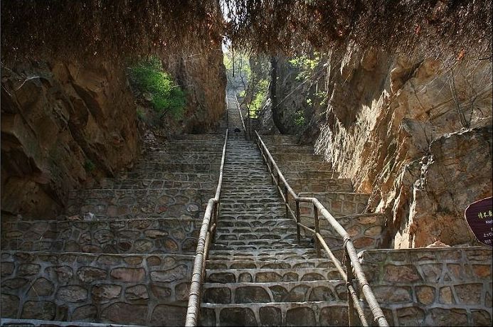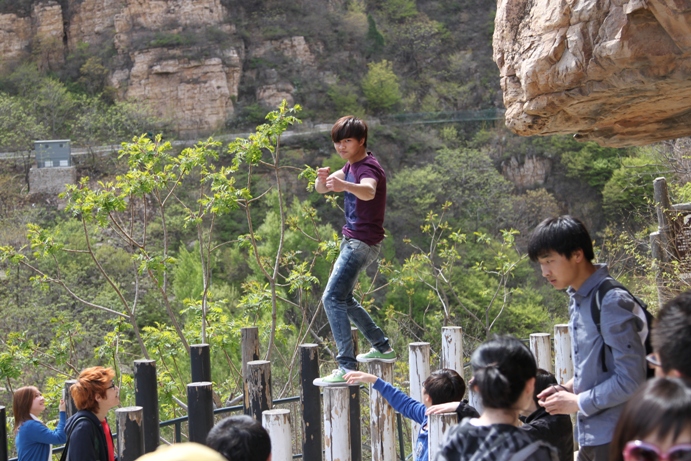 乘着和煦的春风,沐浴着明媚的阳光,经过近三小时的车程,终于到达了风景秀丽的石林峡景区。景区内植被茂盛,岩石奇特,随处可见峭拔的山峰,根根直立,如座座石林。虽说是登山,沿途潺潺的溪流、飞舞的彩蝶、清新的空气、盛开的花朵、飞流直下的九天瀑布、苍翠挺拔的奇松怪柏,构成一幅幅惟妙惟肖的天然画卷,让人顿然忘却攀登的疲劳,多了几分游玩的兴致。令同学们印象最深刻的,莫过于峡内赫赫有名的景观——“通天梯”了。这道天梯倚靠陡峭的石壁修凿而成,全程218级台阶,每个台阶几乎只能容下半只脚。不少同学望而生畏,打算放弃;当听说只有爬过天梯,方能欣赏到石林飞瀑、西石林山等美景时,彼此鼓励,相互扶持,最终克服了重重困难,成功登顶。