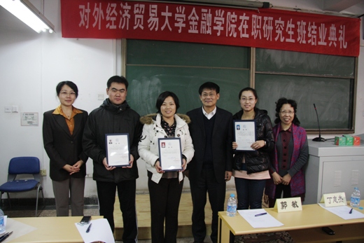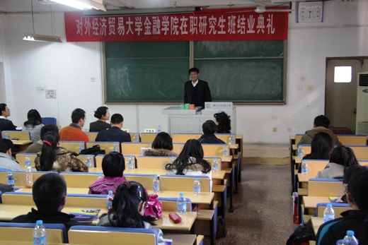 2010 年11月27日 下午,2010届第三期金融皇冠体育网址在职研究生班结业典礼在诚信楼129教室举行。金融皇冠体育网址院长丁志杰教授、分党委书记郭敏教授、培训中心主任唐春梅老师、培训中心办公室主任刘莹老师、胡国仲老师、班主任王祖瑞参加了结业典礼。