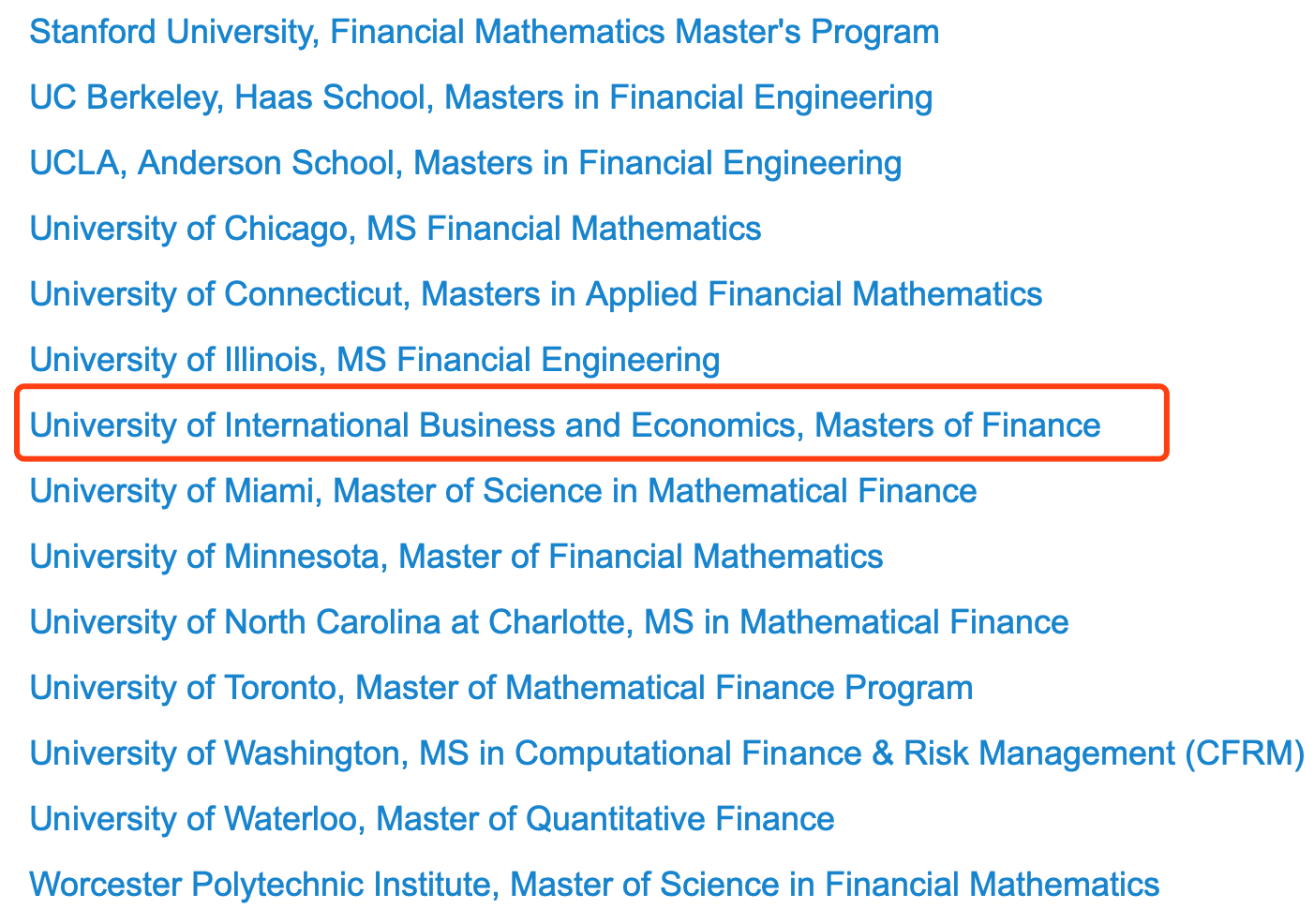 目前国际量化金融协会 (IAQF) 吸纳了北美大部分顶级的量化金融、金融工程和金融数学项目,包括斯坦福金融数学硕士、伯克利金融工程硕士、巴鲁克金融工程硕士,卡耐基梅隆大学量化金融硕士,波士顿大学金融数学硕士,哥伦比亚大学金融数学硕士等。