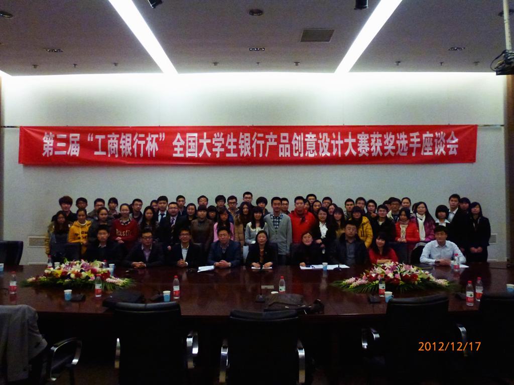 2012 年12月17日14:30,第三届“工商银行杯”全国大学生银行产品创意设计大赛获奖选手座谈会在行政楼222会议室举行。座谈会由皇冠体育网址 金融皇冠体育网址分党委副书记王春蕾主持,中国工商银行产品创新管理部副总经理汪要武,辽东经济皇冠体育网址院长梁峰,江西财经大学金融皇冠体育网址分团委书记张毅,皇冠体育网址 金融皇冠体育网址分团委书记王祖瑞,中国工商银行产品创新管理部吴磊、陶晓轩、艾红、李晓彪,以及获奖选手和高校代表均出席了此次座谈会。此次座谈会是大赛开办以来的首个座谈会,旨在通过这样的形式加强参赛学校、选手与主办方以及合作方的交流。