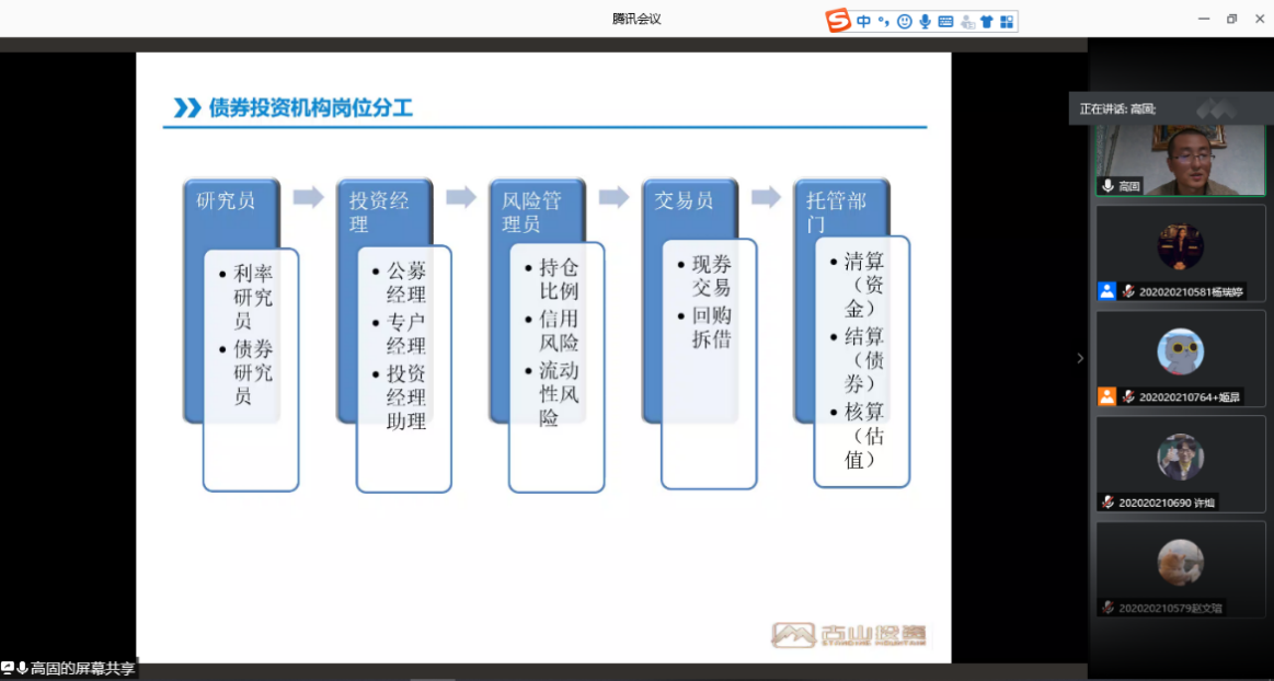 在本次讲座中,高总主要讲了两部分内容:一是对债券市场的框架性介绍以及对当前债券市场的走势分析。高总从债券市场的参与机构、主要投资者和投资工具等角度为同学们建立了债券市场的基本框架,并介绍了参与债券投资所需具备的能力和目前债券投资机构的岗位分工情况,帮助同学们理清毕业后自己可能的入职方向。第二部分高总主要分析了当前的市场情况,为同学们展示了构造投资策略时的思考方式。他认为从M2,GDP等基本指标分析来看,目前经济处于复苏但发展动力不足状态,结合国际形势,债券总体走势不明朗。但投资者仍然需要做出判断,不能模棱两可,在极其混沌的状态下也需要找到未来发展趋势的最大可能性。高总鼓励大家一步步去做,一点点去学,在当前的学习和未来的工作中都要不断学习和积累经验,努力丰富自己的金融素养,增强对经济金融形势的分析判断能力。