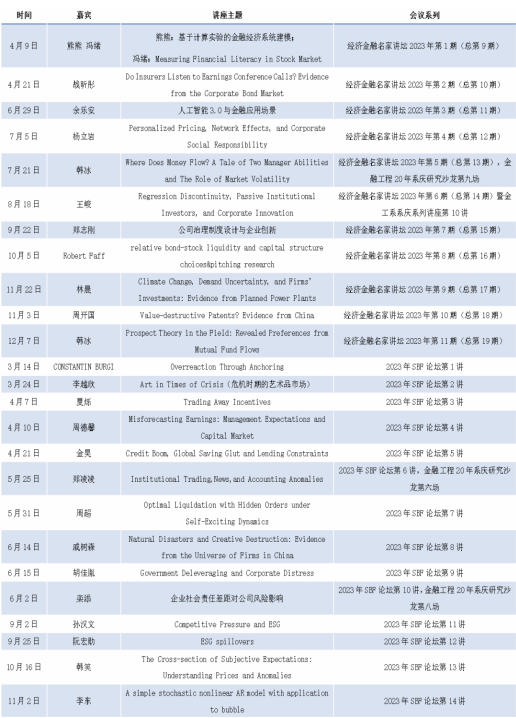 本年度SBF学术论坛共举办18场,邀请了来自北京大学、复旦大学、中国人民大学以及纽约市立大学、英国巴斯大学、法国ESCP商皇冠体育网址等国际、国内各大高校和研究机构的专家学者。讲座主题覆盖面广,包括宏观经济、资本市场、公司金融、银行管理和金融科技等多个领域,还涉及了多个热点议题,如可持续发展对企业绩效的作用、金融泡沫及其动态机制等。