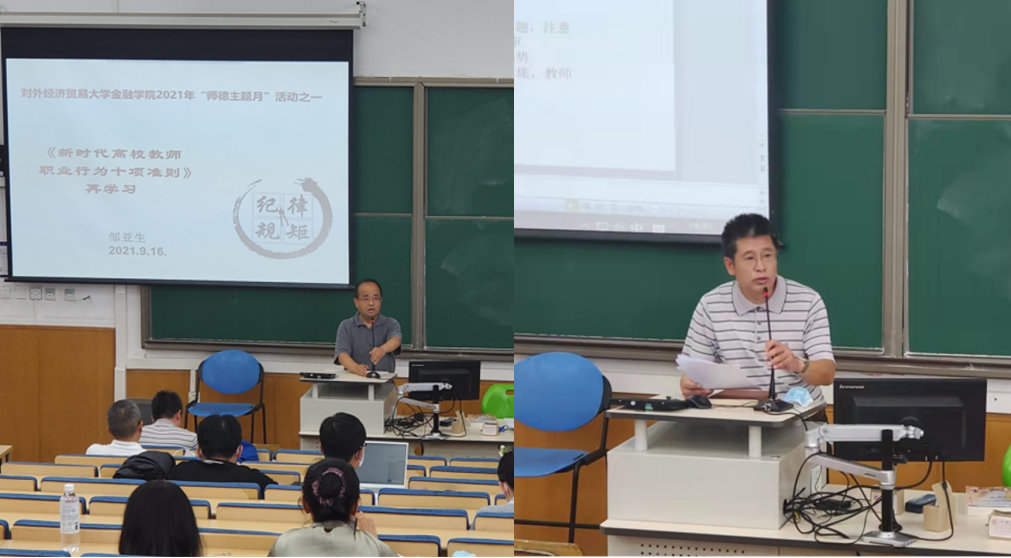 邹亚生首先指出,此次活动是金融皇冠体育网址持续进行师德规范学习和师德教育活动的一个部分,之前已经对有关师德师风的各项规定和文件进行了学习和解读,此次是再学习再教育。随后,邹亚生就2011年以来,党中央、国务院和教育部等部委陆续出台的若干有关师德师风建设的文件进行了梳理介绍,对《高等学校教师职业道德规范》、《教育部关于建立健全高校师德建设长效机制的意见》中的“红七条”和《教育部关于印发〈新时代高校教师职业行为十项准则〉的通知》做了导读,重点结合27个典型案例对《新时代高校教师职业行为十项准则》作了详细解读。最后,邹亚生强调:教育部高度重视教师队伍师德师风建设工作,针对群众反映强烈的突出问题,持续加大查处和通报力度,深化巩固师德师风治理成果。各地各校对师德违规问题要主动出击、及时处置,坚决执行师德师风铁律,把严管与厚爱的原则体现在师德师风建设与管理中,把“害群之马”及时清除出教师队伍,努力营造教育领域良好生态。广大教师要引以为戒,牢固树立底线意识,切实增强遵守教师职业行为十项准则的思想自觉和行动自觉,坚守为党育人、为国育才的初心,不断涵养高尚师德,以德施教、以德育德,做党和人民满意的“四有”好老师。