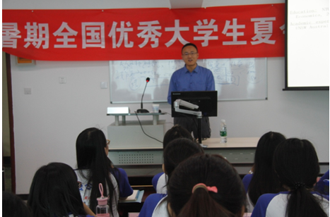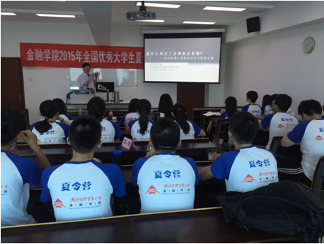 专题讲座环节,丁志杰校长助理向同学们介绍了十三五期间对外金融战略与政策调整,鼓励大家多注重经济金融与实际问题的结合,善于运用现代信息技术拓展自己的学习;张博辉博士则以自己的亲身经历与同学们分享其关于国际金融的一些看法,对大家所关注的近期中国股市动荡发表了自己的见解,与同学们分享了媒体金融这个新兴概念;郑红亮研究员从经济全球化的视角出发,对中国经济新常态进行了解读,并对一些中国经济的热点问题例如上海自贸区、京津冀一体化等与营员们进行了探讨;韩会师博士对商业银行业务以及货币政策工具进行了介绍,并就银行配资对股市所带来的影响发表了看法;张海云教授就资产证券化这个问题与营员们展开深入交流,并对同学们困惑的研究方向选择提出自己的意见和建议;吴卫星院长突破以往的教学模式,就其研究的公募基金这个课题与同学们进行深入探讨,以实际的案例引导同学们学习如何运用金融知识。营员们积极反馈,此次夏令营活动不同于以往学校的学习课程,理论和实际联系非常紧密,老师们的经验分享和知识传授让营员们觉得受益匪浅,每次课程结束后,营员们仍积极对课程内容与老师进行深入探讨,踊跃地发表自己的想法见解。