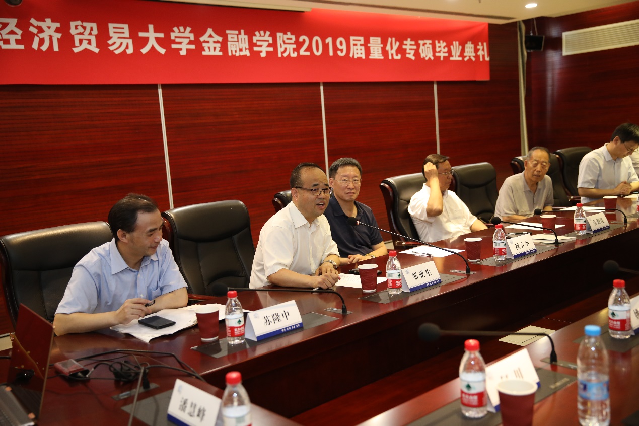 (记者:刘宇环 照片提供:张燕生)6月21日上午10时,金融皇冠体育网址2019届量化专硕毕业典礼于科研楼校董会会议室举行。中国科皇冠体育网址严加安院士、中国人民大学程方平教授、清华大学中国礼学研究中心办公室主任姚刚(受清华大学首批文科资深教授彭林教授委派代表出席)、中国地质大学代表徐春骐、《简明艺术辞典》副主编潘树成、副校长张新民、研究生院院长吴卫星、金融皇冠体育网址院长邹亚生、研究生院副院长蔡永明、档案馆副馆长苏隆中出席活动。此外,还邀请了校外量化专硕导师:罗颜、姚忠兵、玄耀、何川,校内导师:冯建芬、曹诗男、陶利斌以及研究生教务员曾英、2019届量化专硕全体毕业生及20位家长参加此次毕业典礼。量化专硕项目主任潘慧峰主持本次毕业典礼。