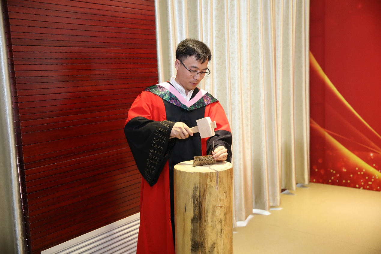 没有荣誉感的仪式,就没有仪式感,由荣誉感浇铸的仪式感,厚重、坚实。毕业典礼的最后一个环节是最具荣誉感和仪式感的毕业铭章授予仪式!首先由校外导师,在每枚镌刻着毕业生名字的毕业铭章上沿,现场用木锤、钢印一一铭刻毕业铭章的授予年份印记。再由校内导师正式授予每位毕业生毕业铭章,最后,校外导师、校内导师与毕业生合影留念。